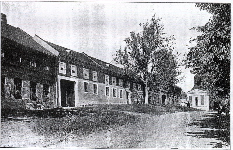 Číslo popisné 11. (rodina Běhalova) a č.12 (rodina Stančíkova), v pozadí kaplička z roku 1909. Foto okolo r. 1910.